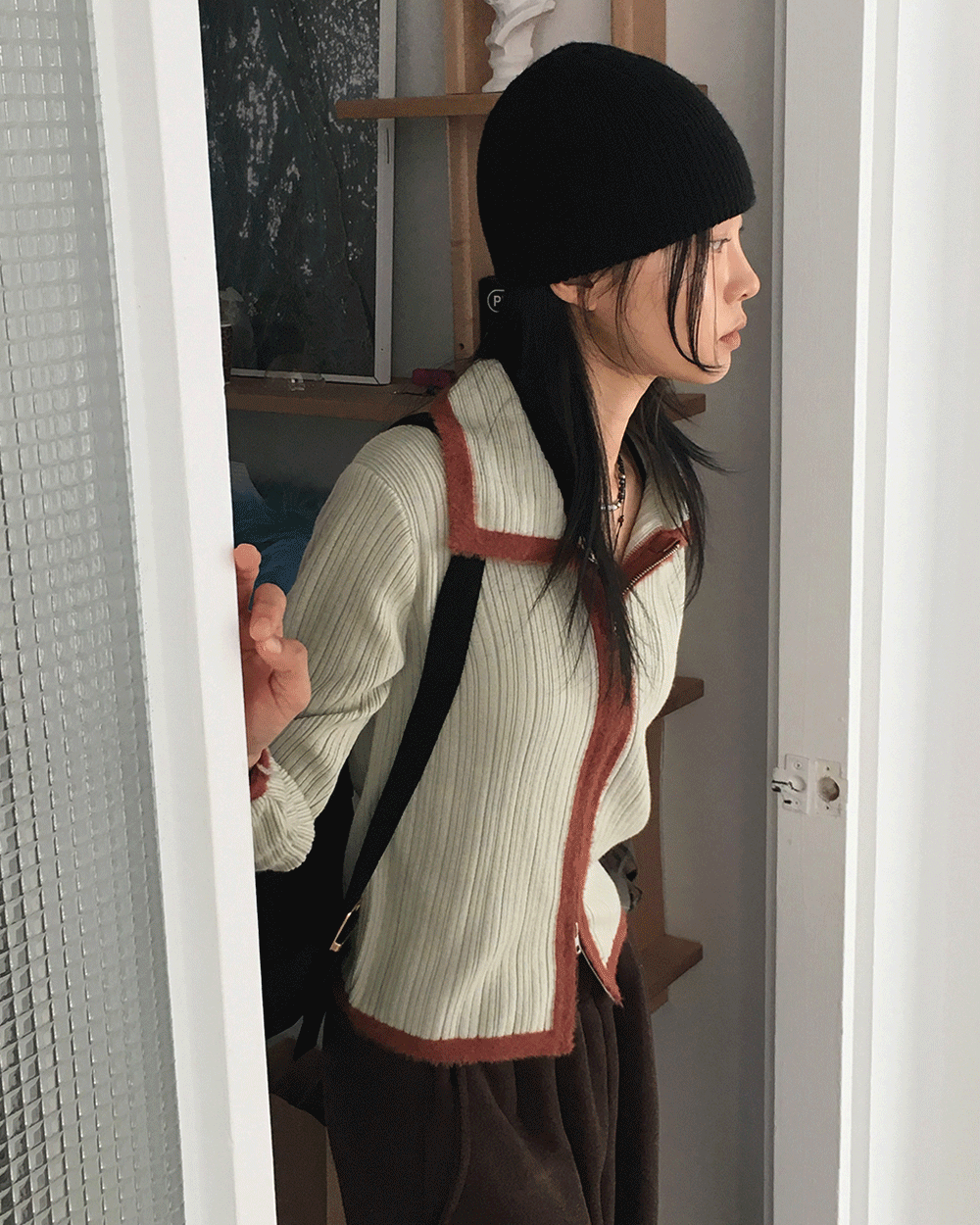 호퓨 퍼 배색 투웨이 골지 크롭 긴팔 집업 가디건