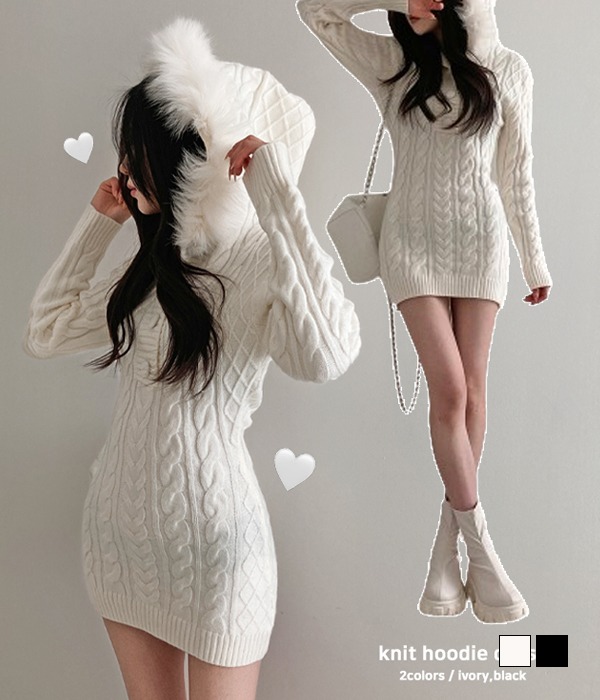 [무료배송] 리얼대존예, 윈터 폭스퍼 후드 울 꽈배기 니트 미니원피스