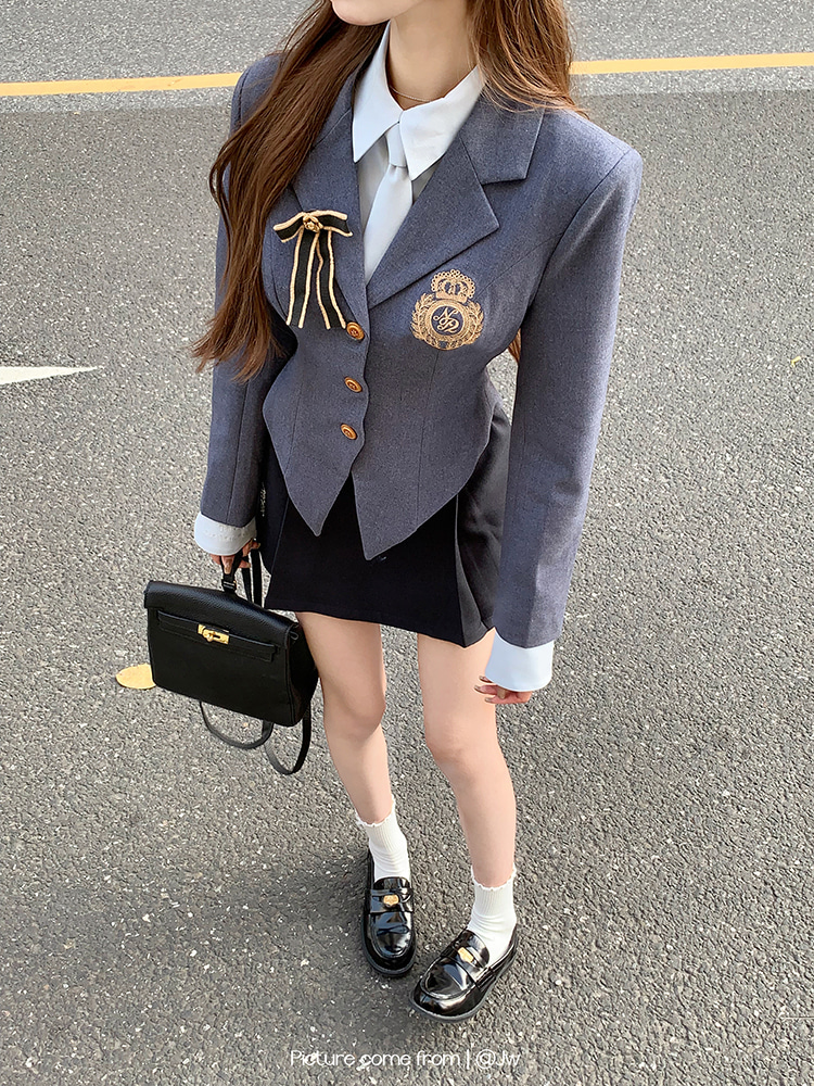 그레이/브라운 언발 영국 모직 블레이저 교복 자켓 크롭 숏 와펜 스쿨룩 캠퍼스 20대 30대 연말룩 크리스마스 데이트룩