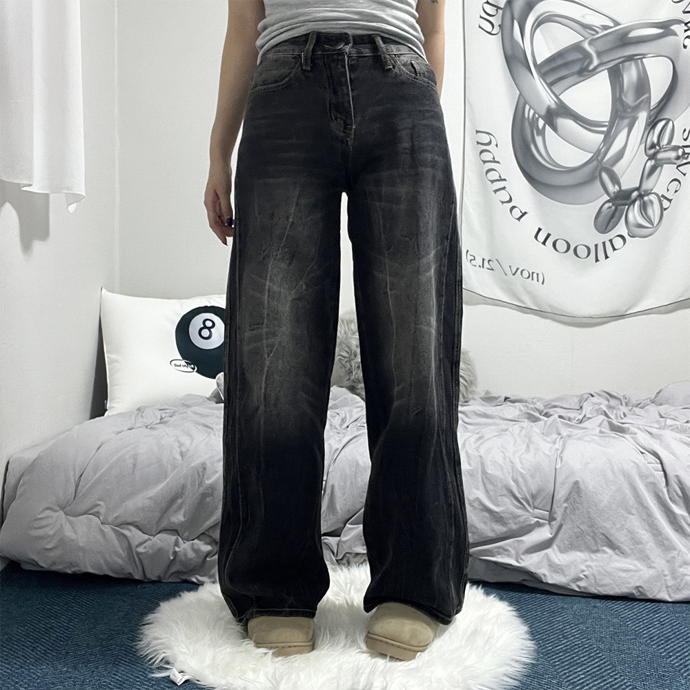 테브 절개 블랙 빈티지 워싱 와이드 데님 팬츠
