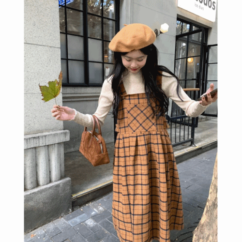 겨울 신상 브라운 체크 멜빵 모직 a라인 플레어 롱원피스 모직스커트 멜방 서스펜더 귀여운 원피스 데이트룩 여친룩 봄 코디 빅사이즈