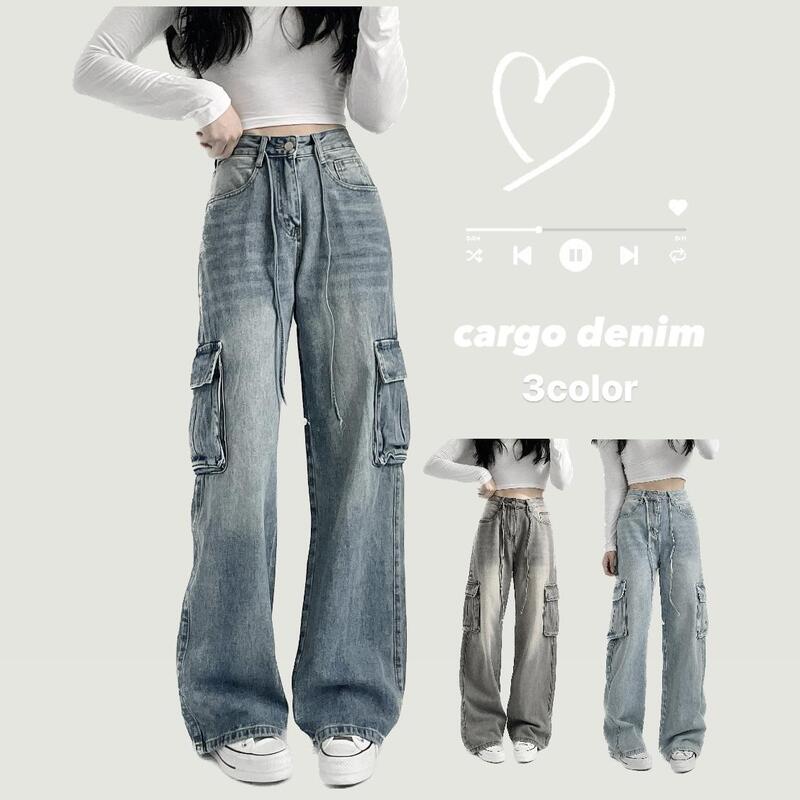 빈티지카고데님💗허리조절, 스트링 워싱 하이웨스트 일자 와이드 데님팬츠 청바지 3color