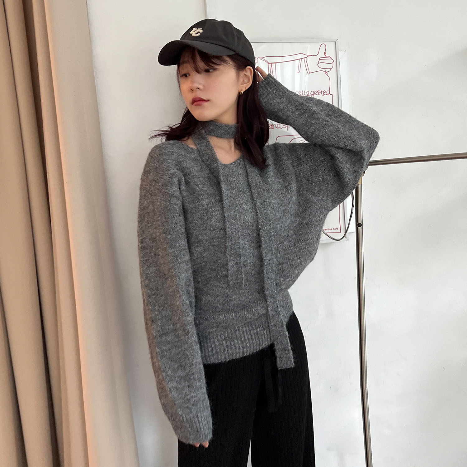 [국내생산/저렴버전아님/오프숄더니트/모헤어니트/브이넥니트/초커세트] 테온 울 초커 타이 브이넥 니트
