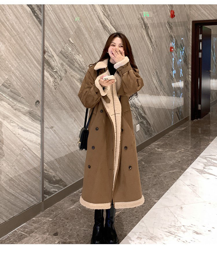 여성 겨울 양모 안감 스웨이드 롱 코트 더블 자켓 하이넥 허리 손목 벨트 웨스턴룩 두껍고 따뜻한 캐주얼 데일리 겨울 트렌치 코트