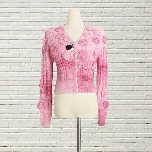 고퀄 입체꽃 핑크 브이넥 니트가디건