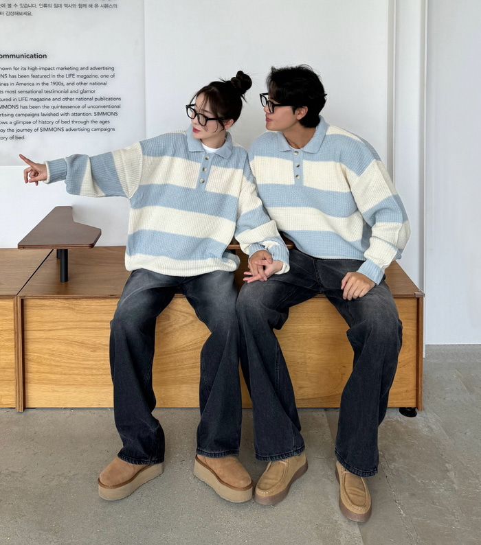 *초특가[고퀄/4컬러/세트가능] 남녀공용 단가라 하찌 니트 커플룩 스트라이프 겨울니트 봄 가을 꾸안꾸 데일리룩 시밀러룩 흑청 와이드팬츠 세트 오버핏 카라 맨투맨 커플 데이트룩