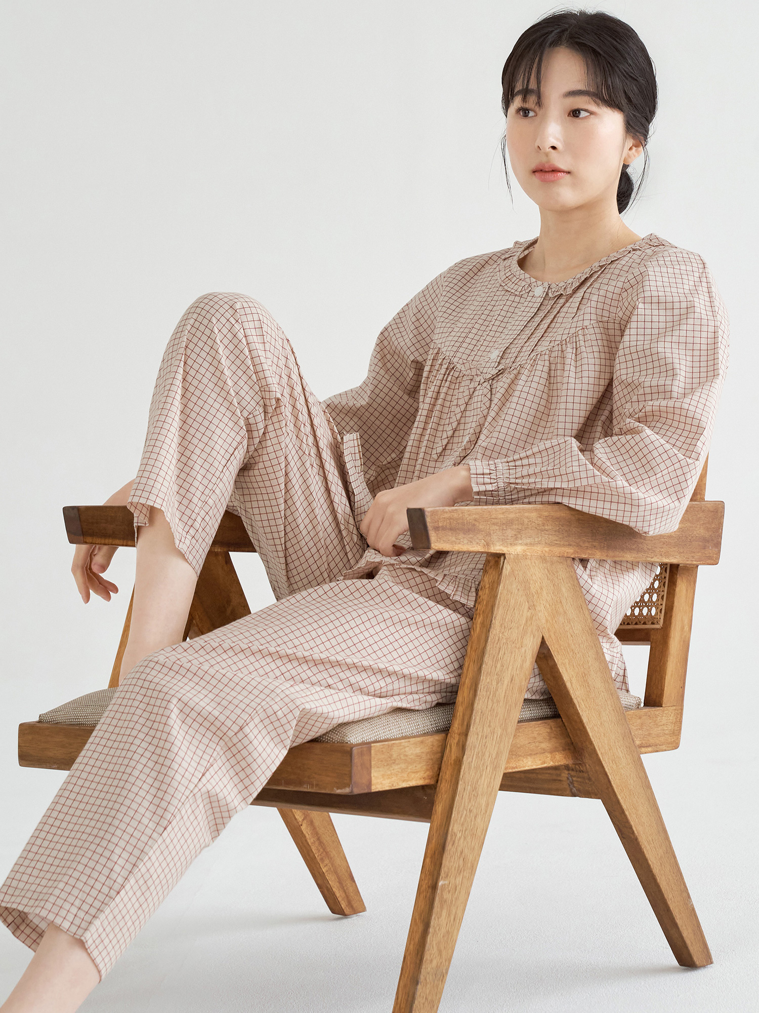 베이지체크 순면 여성 긴팔 빅사이즈 잠옷 세트