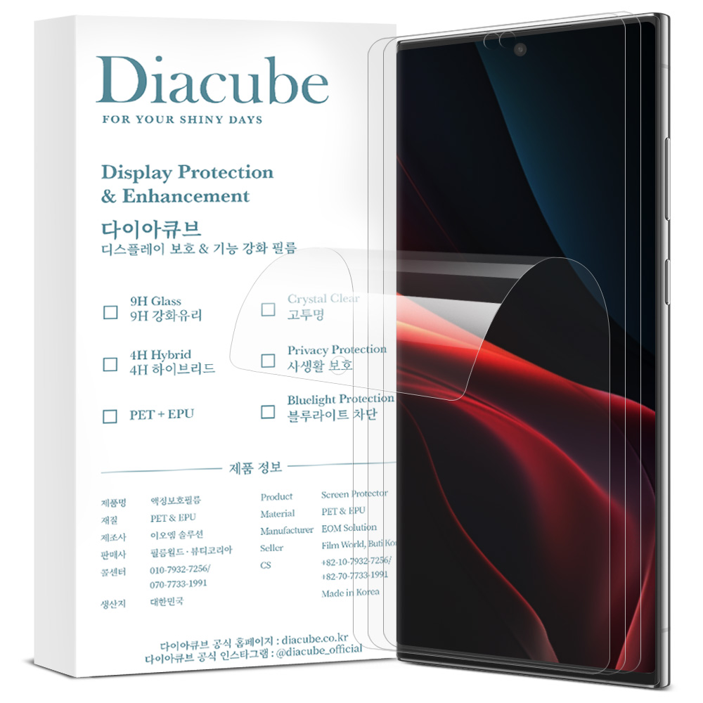 [🚀당일발송/국내생산] 다이아큐브 갤럭시 S24울트라 깨지지 않는 6H유리코팅 PET EPU 완벽지문인식 방탄강화 액정보호필름,3매 가이드핀 간편부착