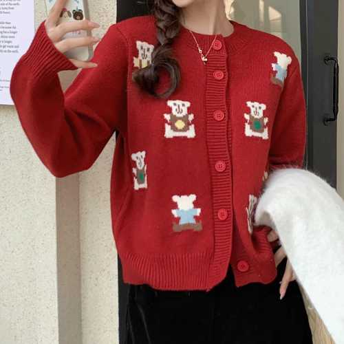 레드 여성 캐주얼 프린팅 크리스마스 라운드넥 니트 가디건 J26