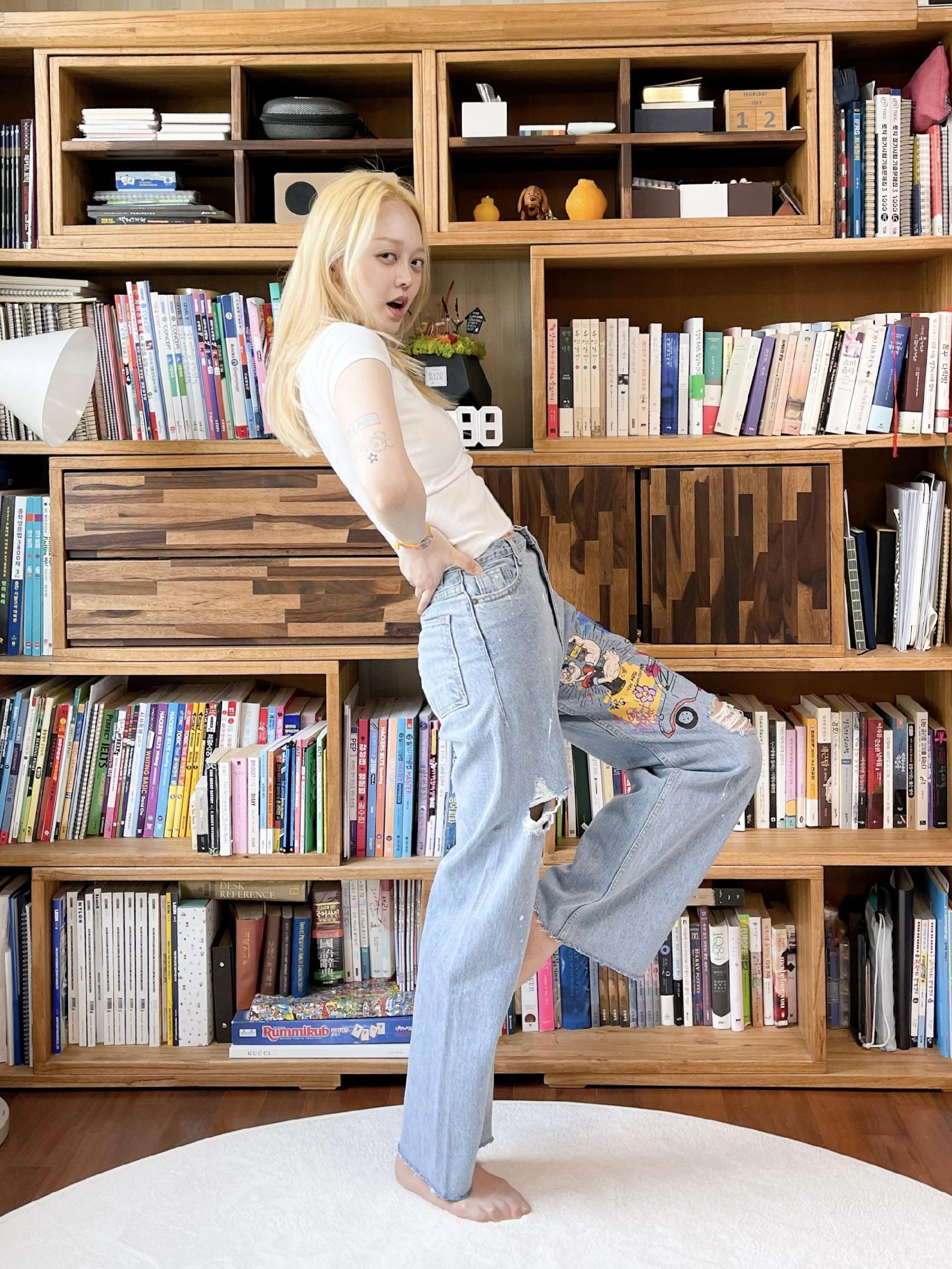여성 귀여운 뽀빠이 나염 와이드 일자 찢어진 청바지 데님(S-L)