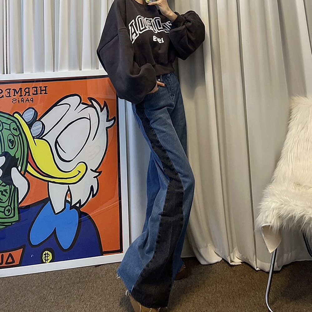 [최저가✨/당일발송🚚/핏보장/다리길어보임/44-77/라인데님/체형커버/데님/유니크/롱다리핏/사이드/흑청/중청/빈티지/통팬츠/빅사이즈] 배색 하이웨스트 통 부츠컷 와이드팬츠 청바지