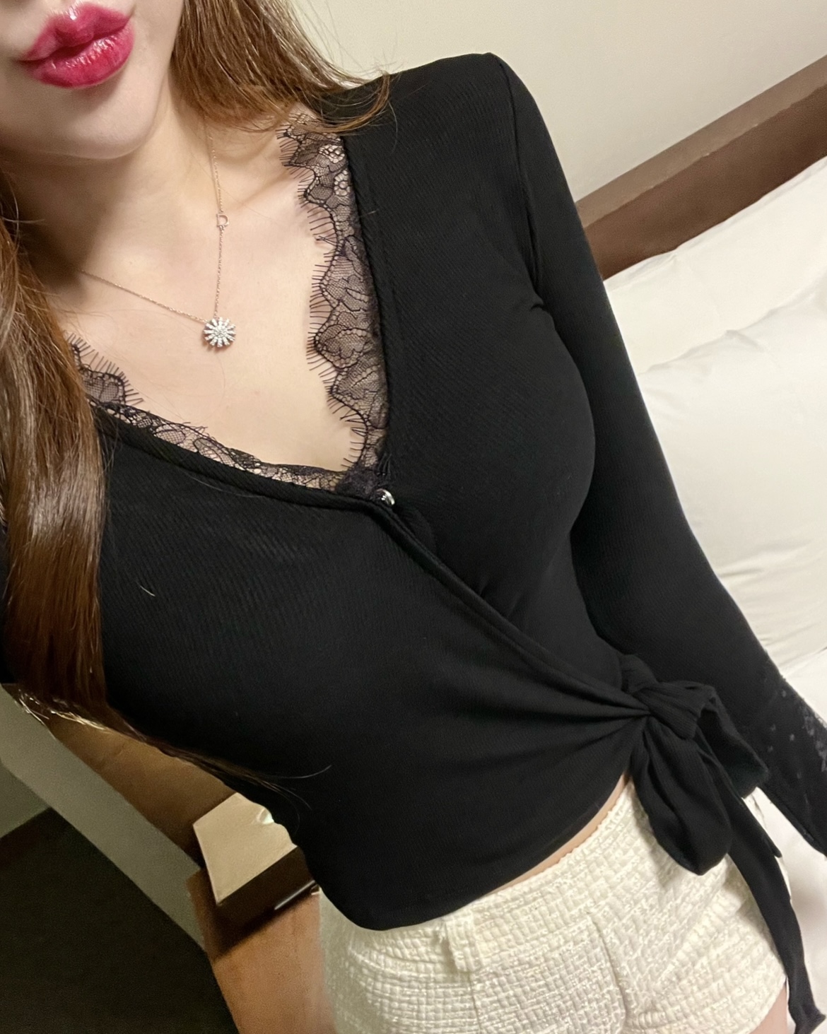 *오늘출발*[섹시글램/몸매보정] 델르 레이스 브이넥 랩 골지 크롭 긴팔티셔츠 랩티셔츠 브이넥 골지니트 소내나팔티셔츠 리본티셔츠 레이스니트 셔링티셔츠 랩가디건 수입의류 3color