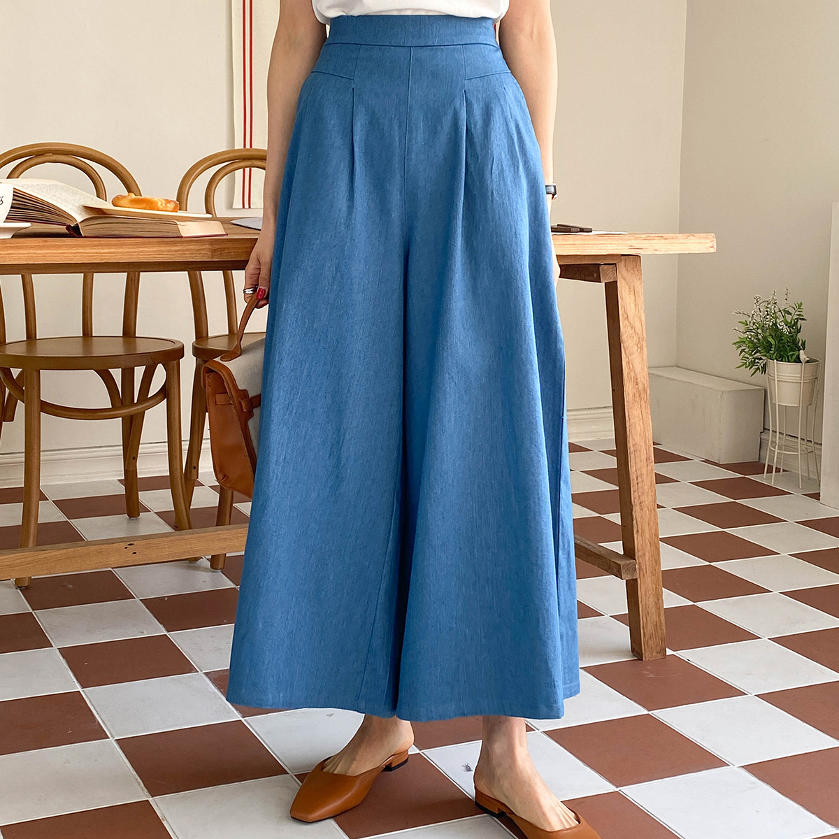롬브레 허리 밴딩 슬릿 와이드 팬츠