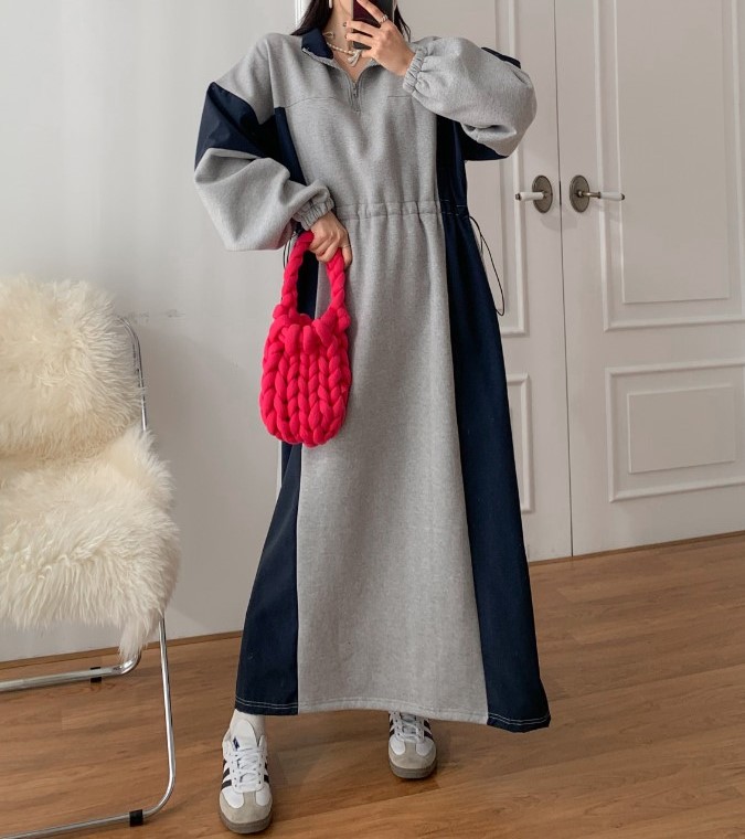 노르딕 원피스 (기모 배색 빅 사이즈 플러스 안감 스트링 반전 합포 롱) - 검정, 메란지