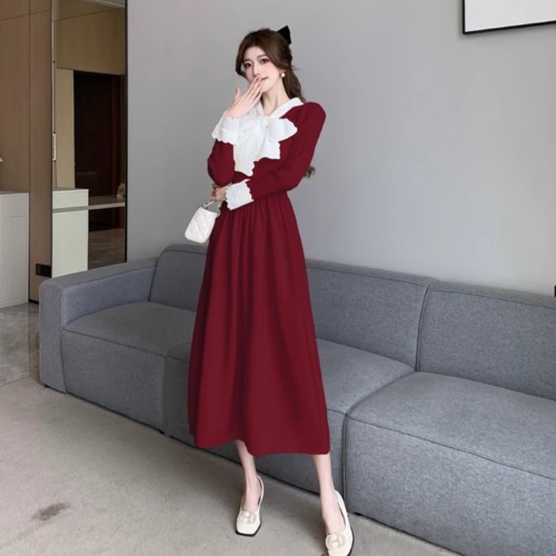 [겨울원피스/하객룩] 리본타이 단정한원피스 니트 A라인 플레어롱드레스 고급스러운 타이블라우스 레이스 레드 면접 하이웨이스트 골지 겨울 롱원피스 결혼식 파티룩 돌잔치 이벤트 옷 77 아나운서 승무원 빅사이즈 오피스룩