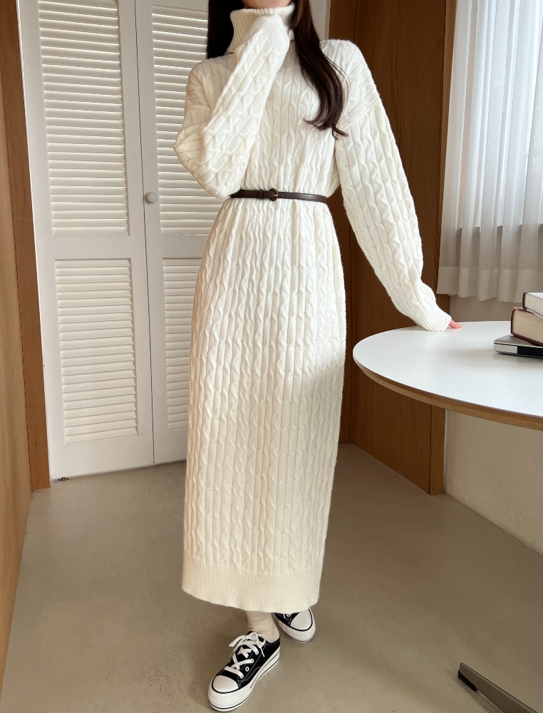 파이 꽈배기 하이넥 목폴라 루즈핏 롱 원피스