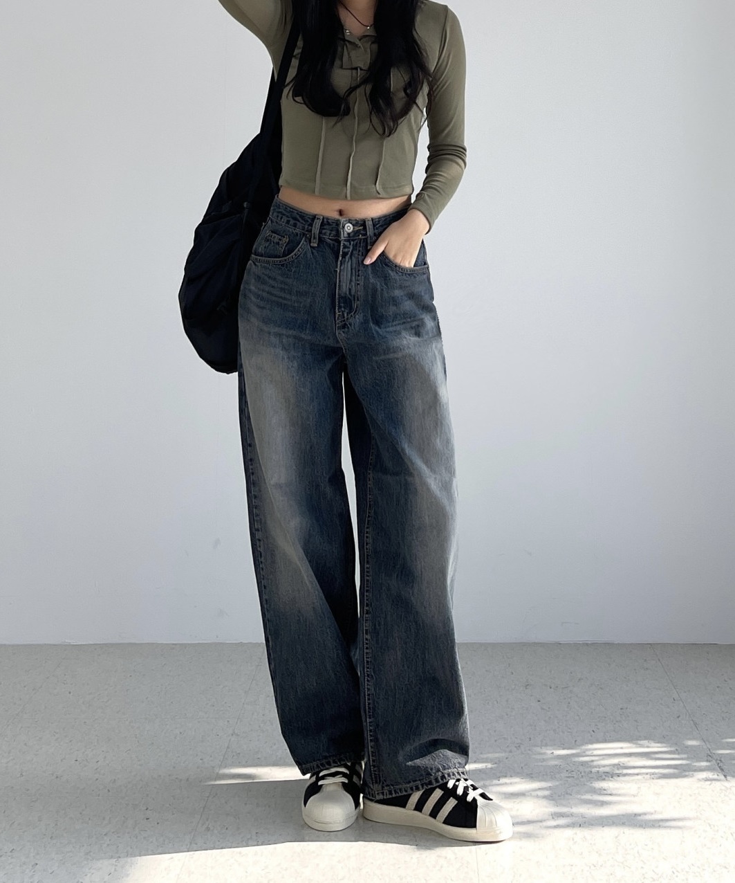 커브드데님 여성 와이드청바지 벌룬핏 오버핏 진청바지 봄 가을 빈지티 워싱진