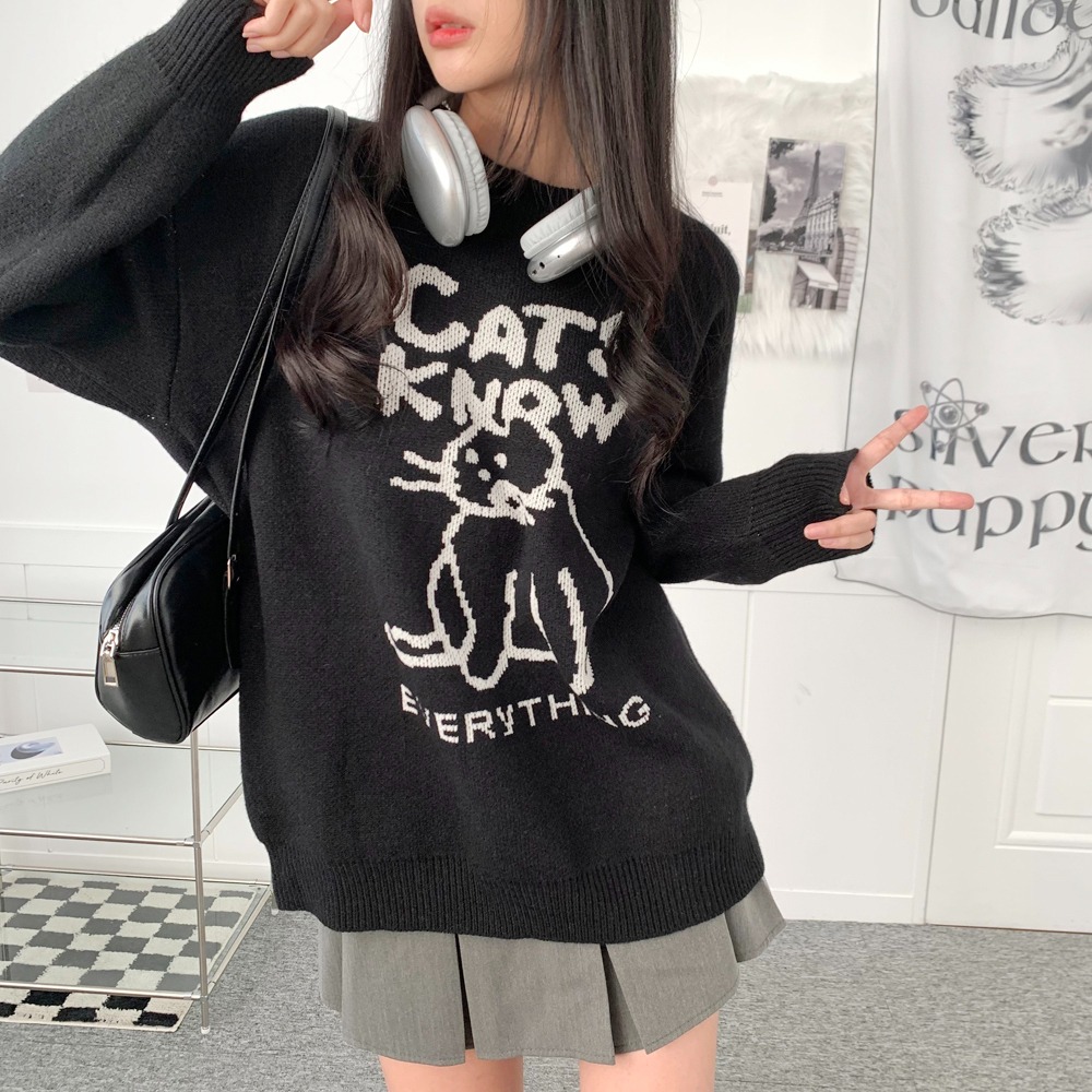 캣츠 고양이 낙서 프린팅 루즈핏 니트