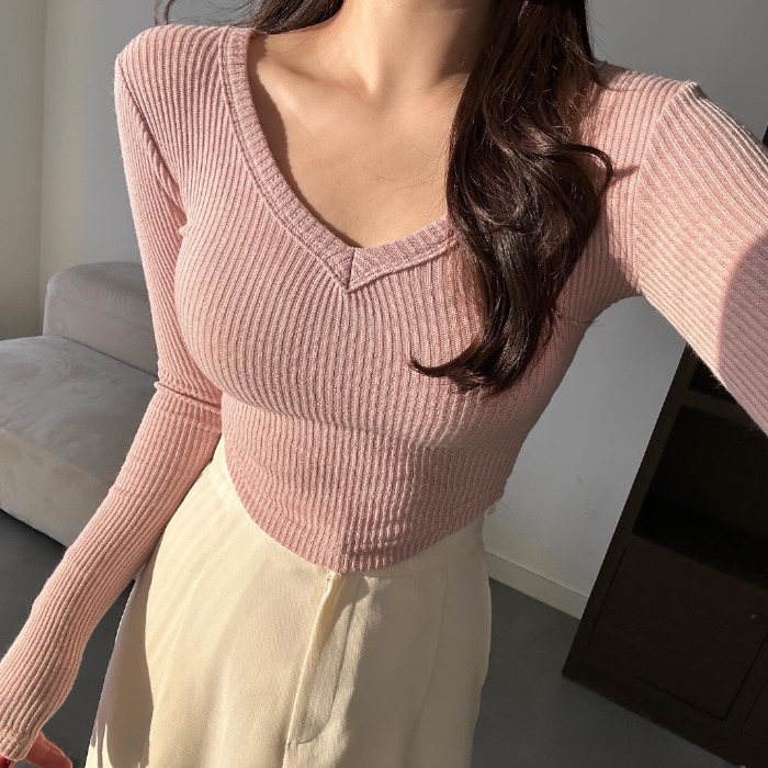 (울8%/기획) 슬림핏 딥 브이넥 니트 골지 굴림 밑단 크롭 긴팔 티셔츠