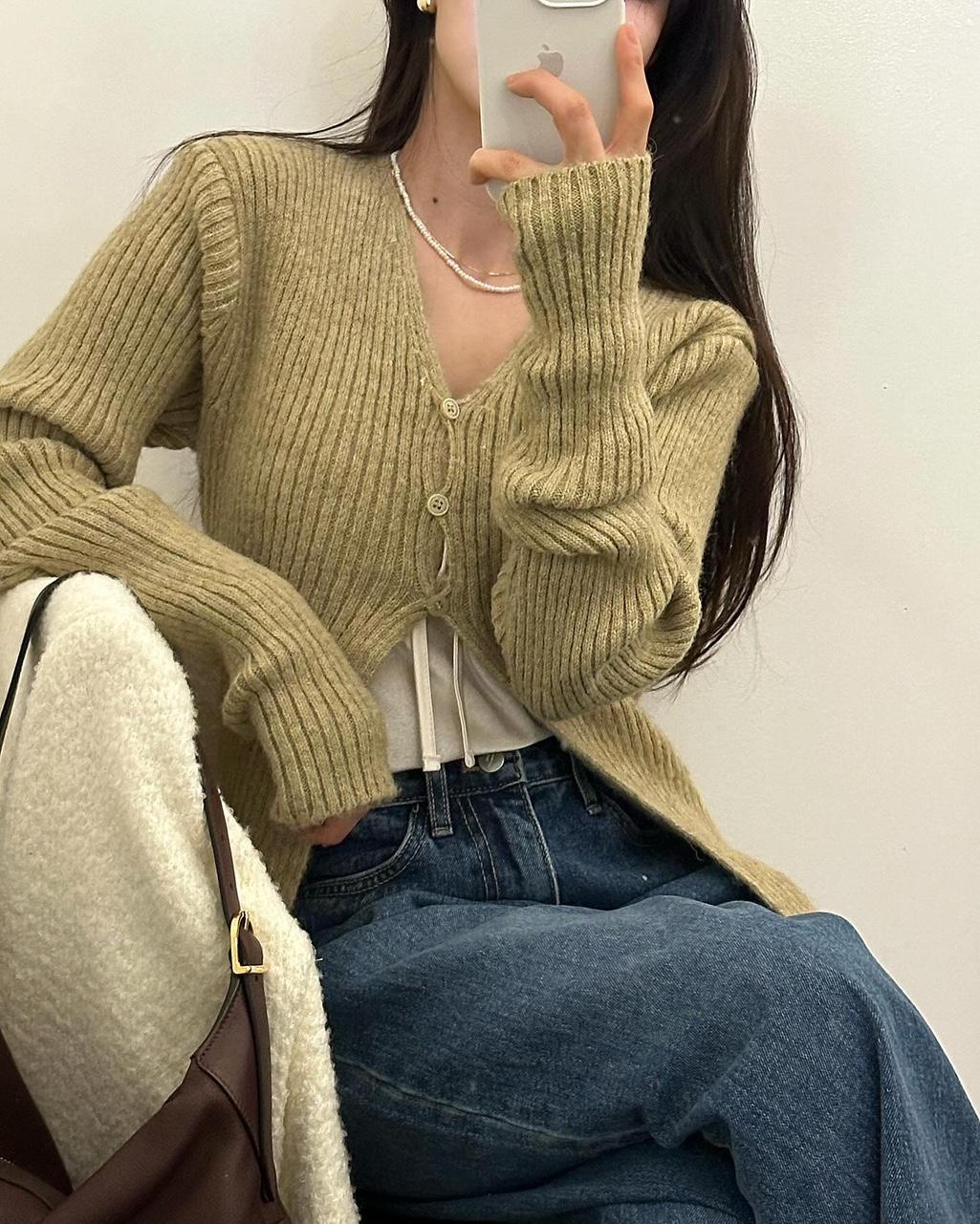케멜 여성 브이넥 울 골지 레이어드 이너 니트가디건