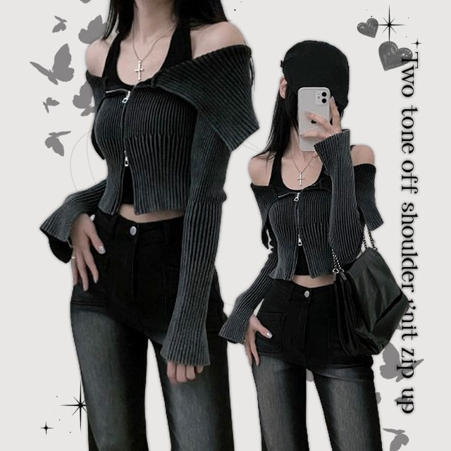 [유니크/투웨이!]투톤그라데이션세일러오프숄더크롭니트집업(3color)