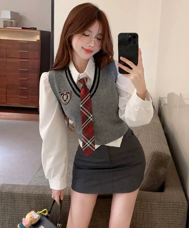 졸업/졸업패션/단체룩 이벤트 컨셉 교복룩 하이틴룩 퍼프 긴팔 셔츠+체크 타이/니트 크롭 베스트/미니 교복 스커트 코디세트