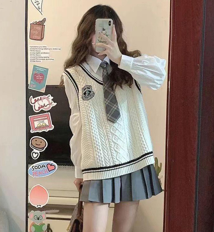 스쿨룩 시밀러룩 교복 컨셉 루즈핏 니트 조끼/타이/셔츠/플리츠 스커트 코디세트 졸업/졸업패션/단체룩