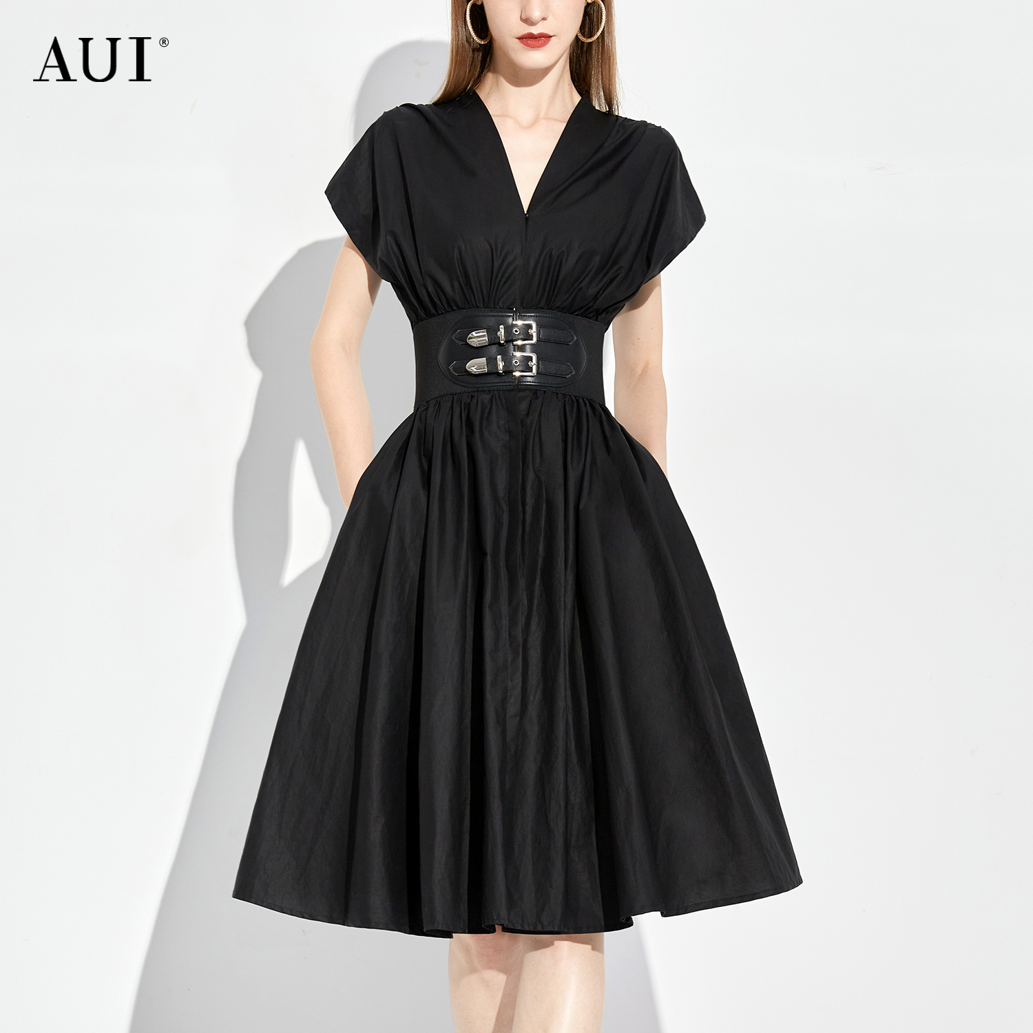 AUI 블랙 햅번 스타일 허리 슬리밍 드레스 여성 여름 새로운 스타일 기질 v 넥 허리 슬림 리틀 블랙 드레스