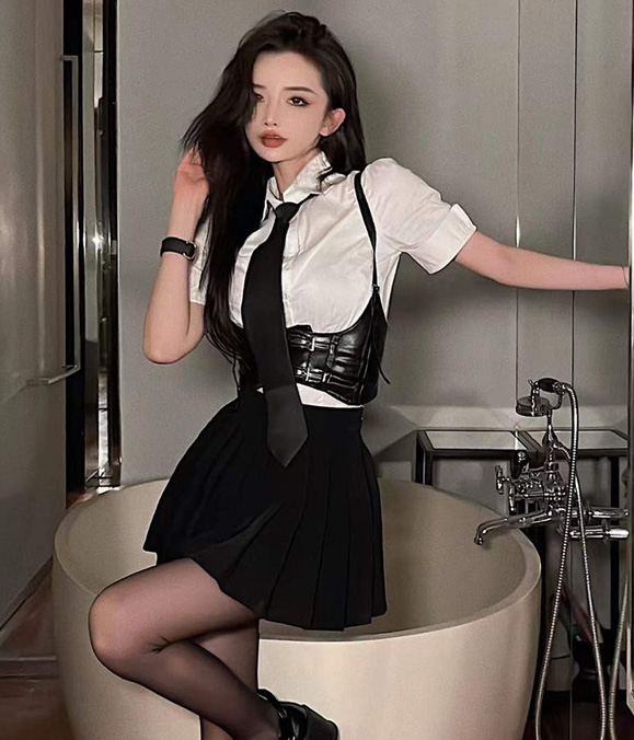 졸업사진/할로윈/단체룩 프레피룩 교복 베이직 반팔 크롭 셔츠+블랙 넥타이+미니 플리츠 테니스 하이웨스트 스커트+유광 레더 서스펜더 벨트 가죽조끼 set