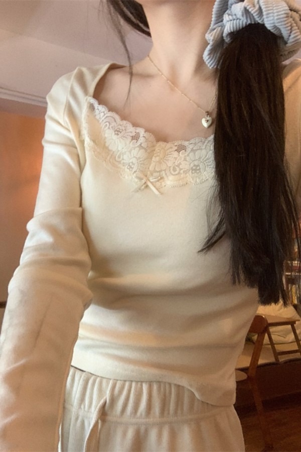 리가 레이스 스티치 스퀘어넥 긴팔 슬리밍 티셔츠