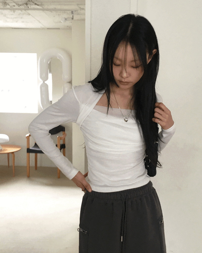 비쉬 발레코어 쉬폰 셔링 볼레로 긴팔 티셔츠