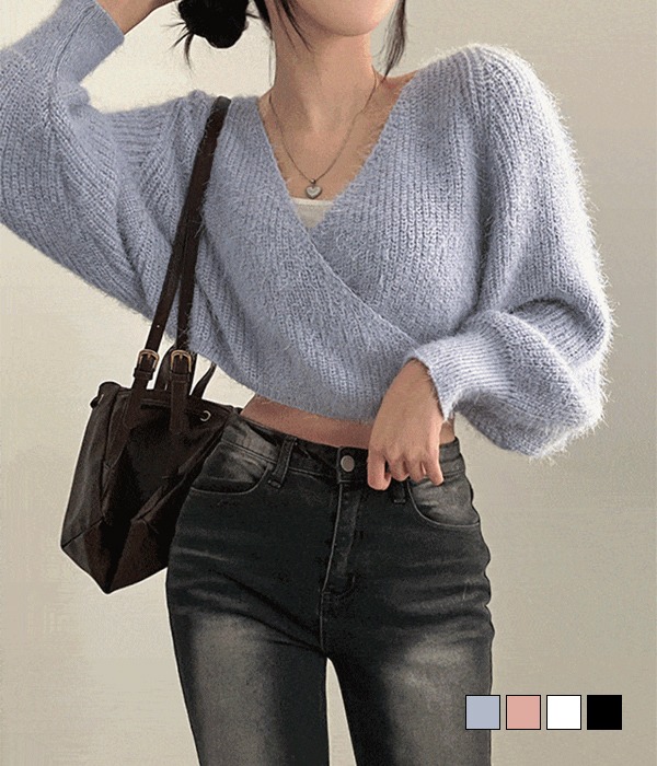 [무료배송] 청순여신 코디 완성, 인생네컷 솔잎 앙고라 랩 크롭 긴팔 니트