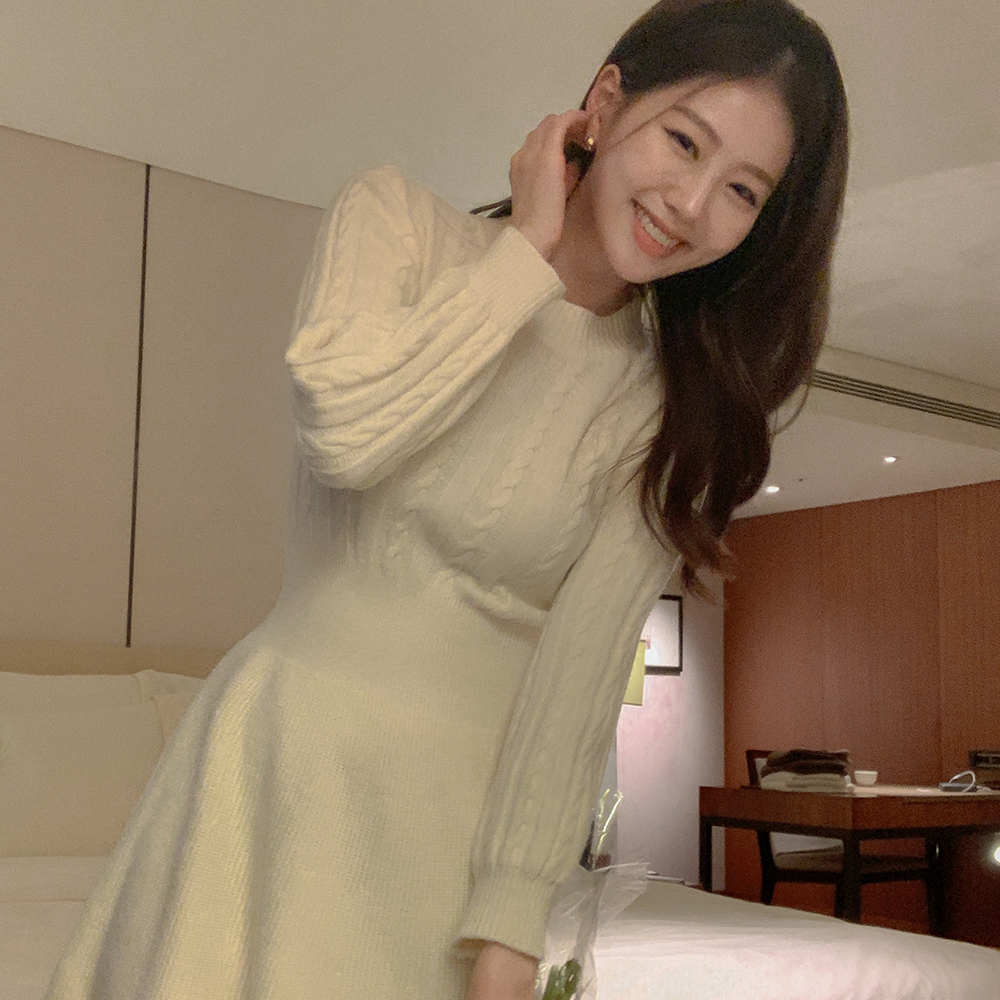 로디엘 라운드 꽈배기 A라인 플레어 니트 원피스(하객룩)