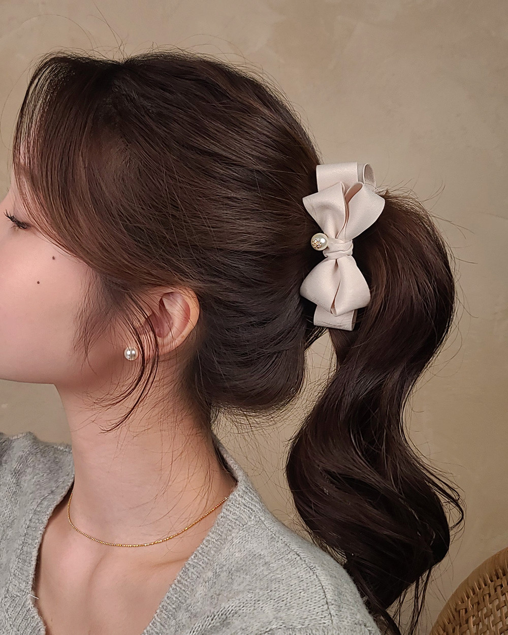 멜리나 6컬러 큐빅 10mm 진주 드롭 포니테일 헤어 집게 볼륨 리본 바나나핀
