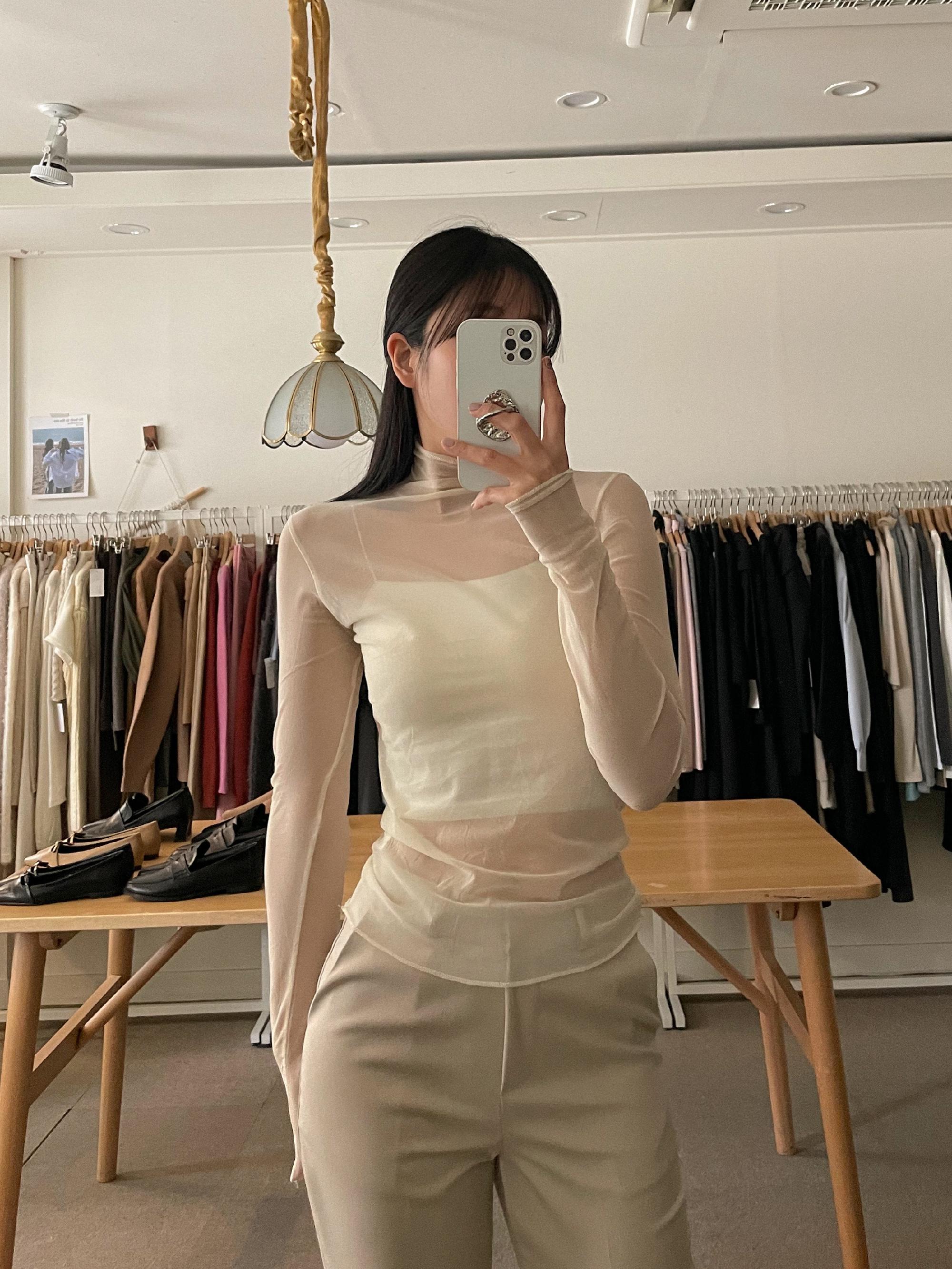 멜팅 여리여리 레이어드 이너 시스루 망사 폴라 티셔츠 (3color)