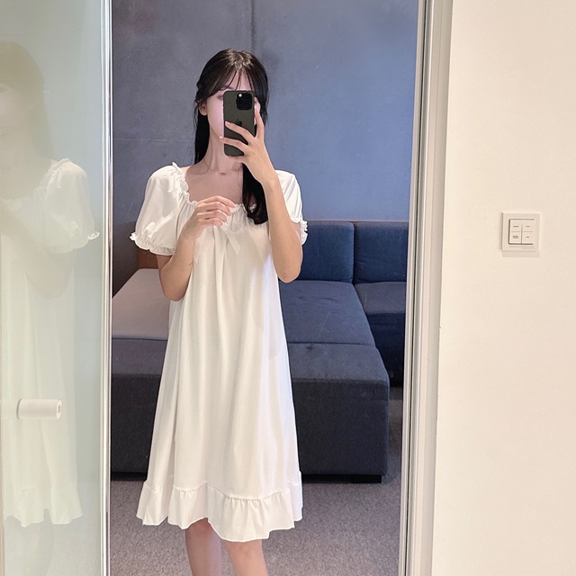 [당일출고] 꿀잠예약 퓨어 프릴 스퀘어넥 리본 반팔 홈훼어 원피스 잠옷