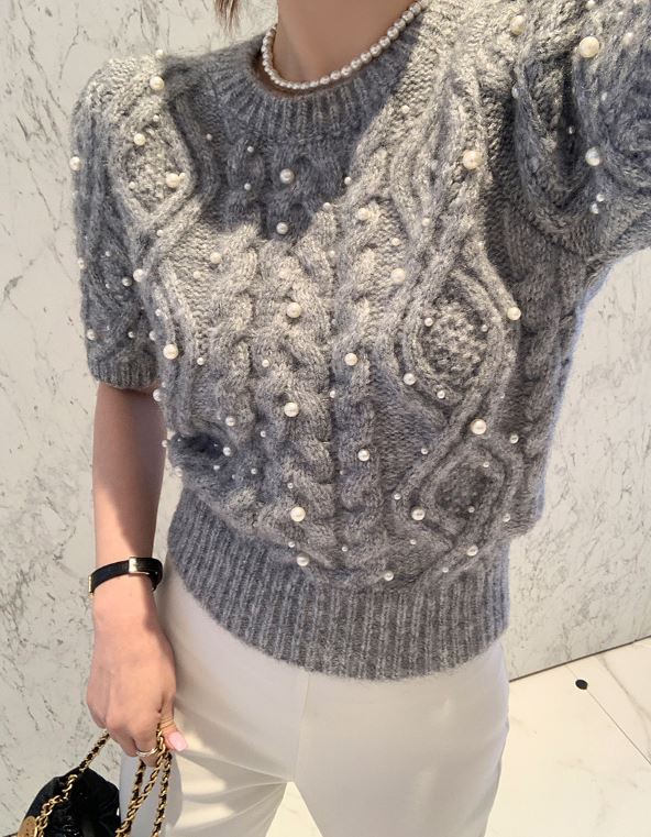 여성스러운 고퀄 울 진주 어깨퍼프 꽈배기 아가힐 도톰 반팔 슬림핏 니트 스웨트 2col