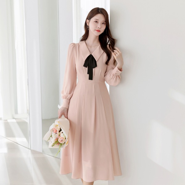 쥴리 리본타이 볼륨소매 핀턱 플레어 원피스