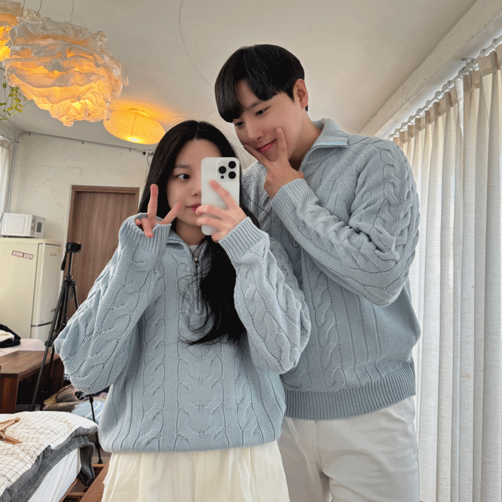 [커플강추❤️] 카슈 케이블 반집업 니트 크롭 오버핏 꽈배기 데일리 캐주얼 커플 시밀러룩