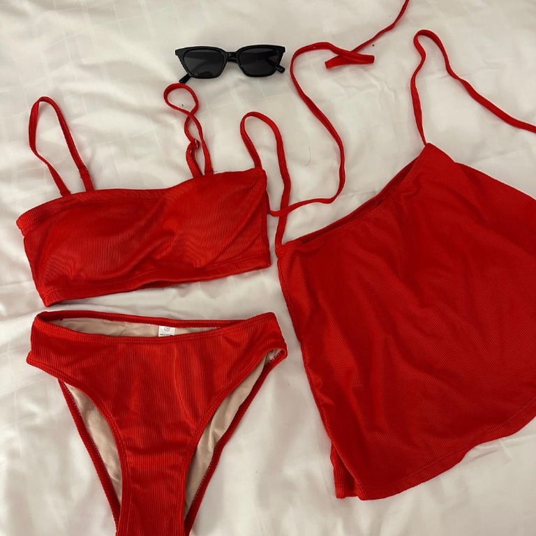 *당일출고* (M-XL) 3pc 쓰리피스 몸매커버 비키니 레드 탱크탑 끈 커버업 스커트 세트