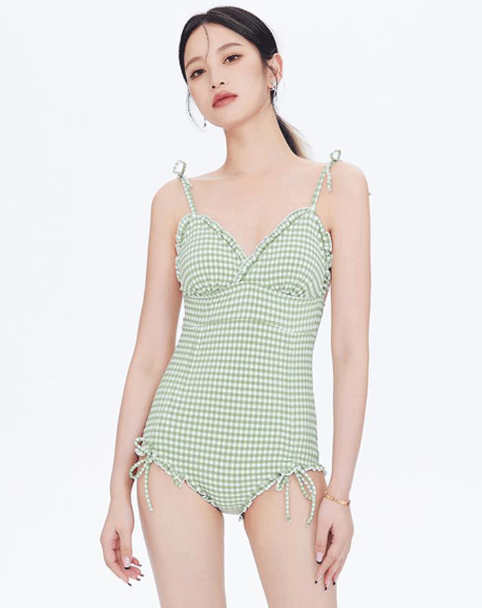호캉스 비치 리본 끈나시 체크 프릴 모노키니 수영복