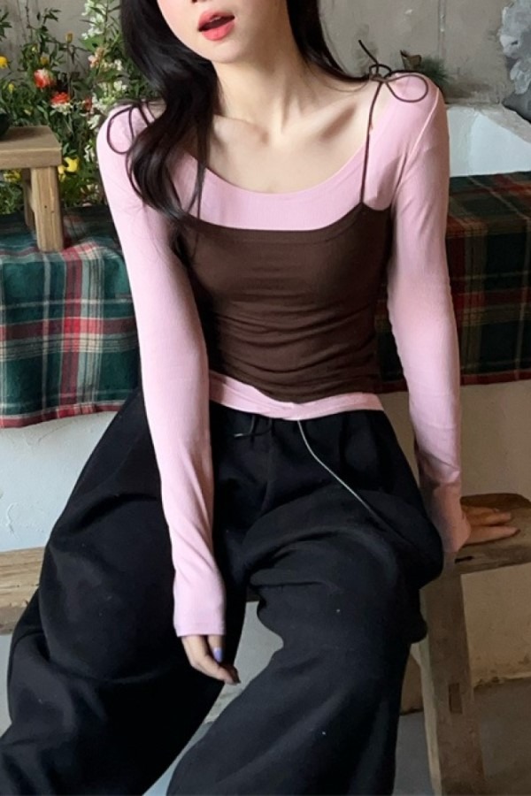 set 핑크 보트넥 긴팔 슬리밍 티셔츠 레이어드 나시 탑 투피스세트