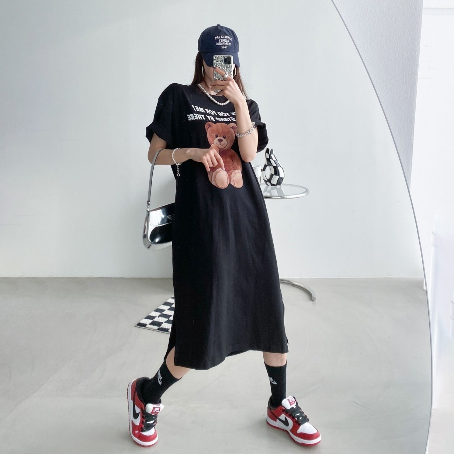 곰 프린팅 루즈핏 라운드넥 반팔 롱티셔츠 원피스