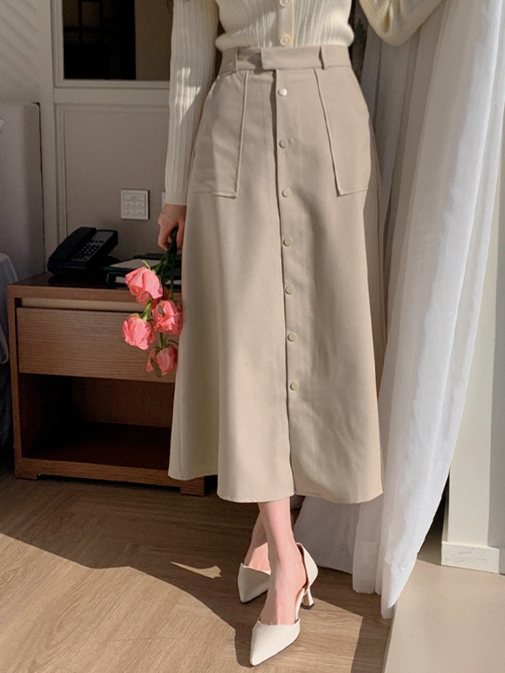 로우디프 포켓 뒷밴딩 스냅버튼 롱 스커트 (봄-신상-자체제작-봄룩-데일리룩-데이트룩-출근룩-오피스룩-하객룩-캐주얼룩-러블리룩-심플룩-캠퍼스룩-롱스커트-뒷밴딩-포켓스커트-스냅버튼-꾸안꾸-봄스커트-편안한-빅사이즈)