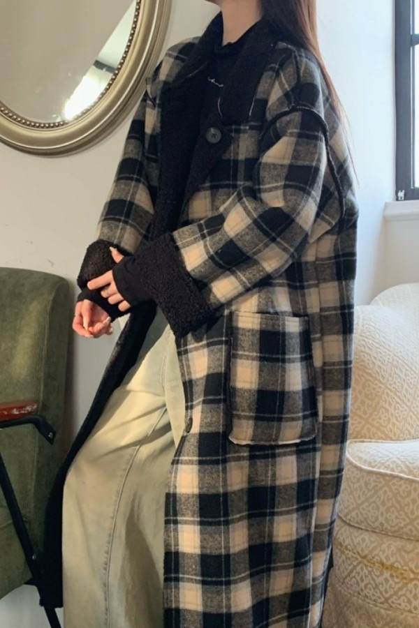 아인 체크 브이넥 안감 양털 긴팔 오버핏 롱코트