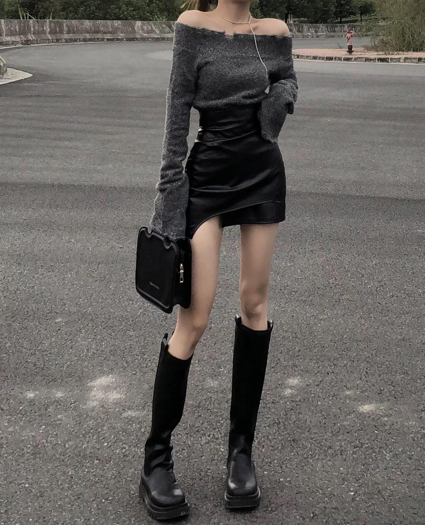 레더 트임 미니스커트 힙한패션 가죽치마코디