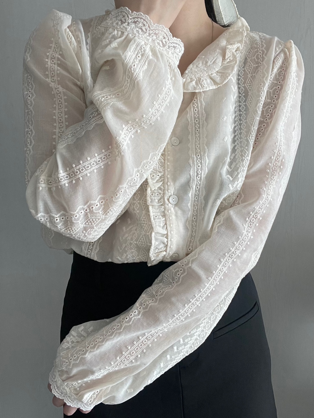 레이스블라우스 프릴카라 펀칭자수 흰색 블라우스