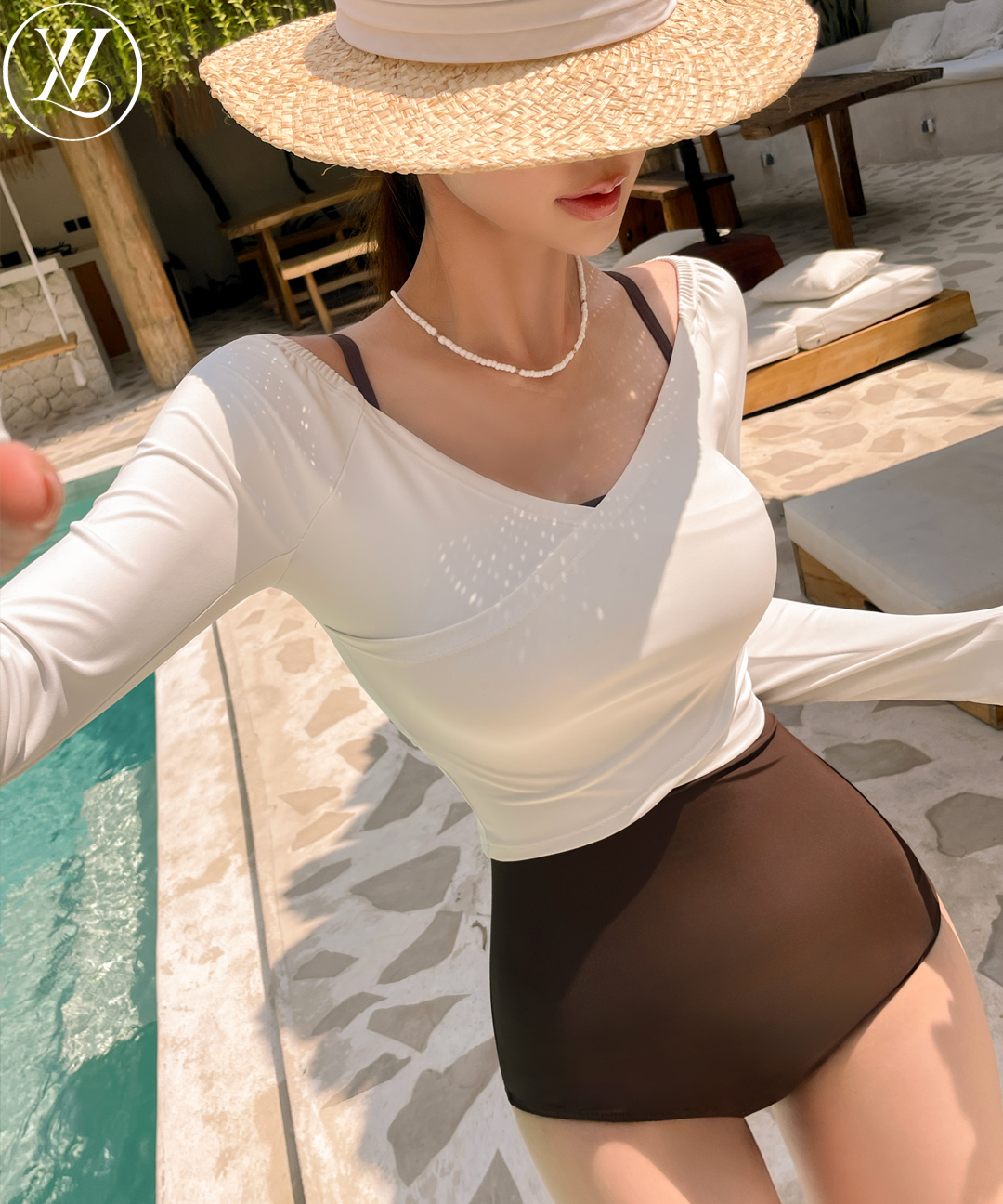 [MADE BY 비바럽]랩 브이넥 래쉬가드[오프숄더/아이보리/커버업/핑거홀/요가/필라테스/자외선차단/수영복/티셔츠/크롭] SW19977F