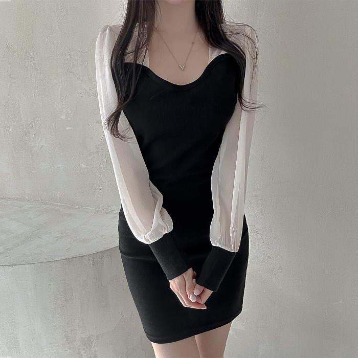 [당일배송🎁여리글램] 미쥬 시스루 쉬폰 배색 미니원피스 슬림핏 핏대박 쫀쫀 퍼프 소매 밴딩 하트넥 골지 니트 미니 원피스 타이트 H라인 섹시룩 파티룩 딱붙는원피스 기념일 여리핏 남심저격 클럽룩 하객룩 하객원피스