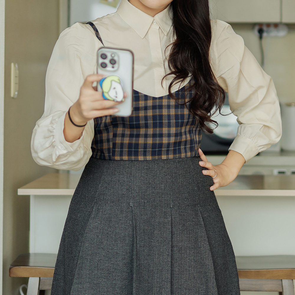 [44~99사이즈] 통통녀 데이트룩 네이비 브라운 체크 끈조절 크롭 탑 레이어드 뷔스티에